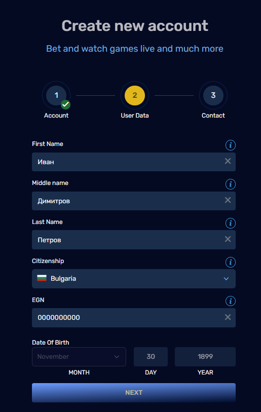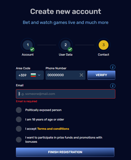 Registration is completed in three simple steps. First, choose a unique username and password. After clicking “Continue,” you’ll move to the second step, where you need to enter your personal details. Finally, in the third step, confirm your phone number. Once all three steps are done, your account will be successfully created.